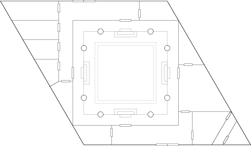 Talon keskellä sijaitseva harjoitteluhalli on osittain avoin keskeltä upotettu sisäpiha, jota ympäröivät neliskanttiset kulkuväylät, ja josta vie ovi jokaiseen pääilmansuuntaan. Noin jaardin verran alempana olevalle harjoitusalueelle laskeutuu joka suunnalta kolme askelmaa, joista ensimmäinen on upotettu ympäröivän kulkuväylän kiveen. Kulkuväylien ja harjoitusalueiden välissä on myös kahdeksan paksua pyöreää pylvästä. Katossa oleva neliömäinen aukko on hiukan pienempi kuin sen alla oleva viitisen senttiä korotettu harjoittelualue.